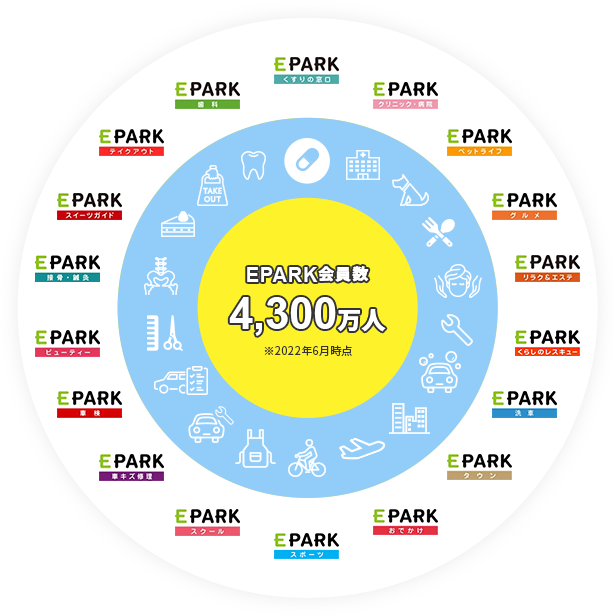 医療関連施設を中心に、さまざまな業態に対してEPARKを展開しています。ユーザーは共通の会員IDが利用できるので、相互集客を実現できます。